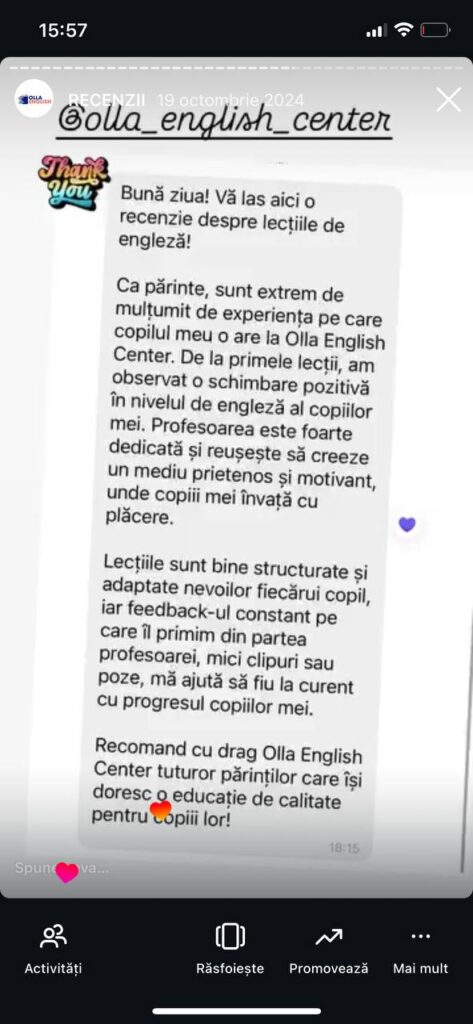 La OLLA English Center, cei mici descoperă engleza într-un mod natural, prin cântece, jocuri și povești. Cursurile sunt create special pentru preșcolari și îi ajută să-și dezvolte vocabularul, pronunția și încrederea în vorbire.